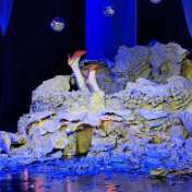 That said, that are other elements that seemed to be added to the original: the play seems to take place over seven days (seven days of creation?); recurring motif of butterflies (an allusion to the Butterfly Lovers?); five baubles (our five senses?) suspended over the main opening of the mound; and the mound looking like a skeletal structure lying over red lights in a blackout. But all of them are conceptually hazy, and end up being window dressing of a superficial absurdist play.
