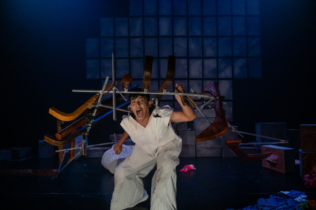 To make matters worse, the general rigidity of straight aluminium rods for the extensions meant that there is a limit to what the puppeteers could do with them. In manipulating Table Boy, Hairi Cromo carries the structure like a shell. And the extension occasionally gets in the way of Vanessa Toh’s movement work as Debris Girl—she has to figure out how to tuck it away when she is on the floor.